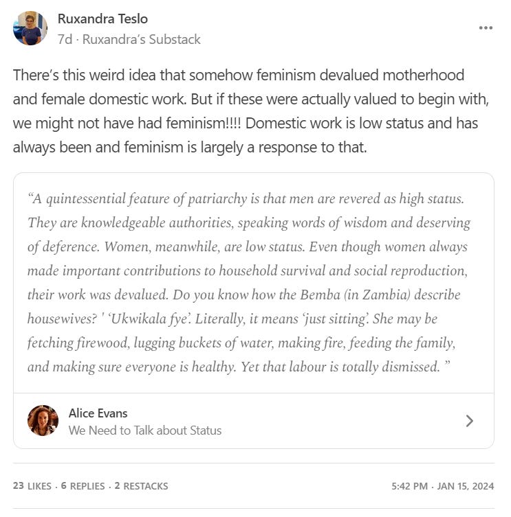 I do think that contemporary popular feminism often implicitly denigrates motherhood and domestic work. Alice’s post explicitly says that this work is lower status and describes it as “serving”. But, if the woman is serving the family by doing the domestic work and the man is working to make money… isn’t he also serving the family? I think this really comes down to choice again - when women choose to stay at home or to have a less intense career describing them as filling a low status service role actually seems misogynistic to me.