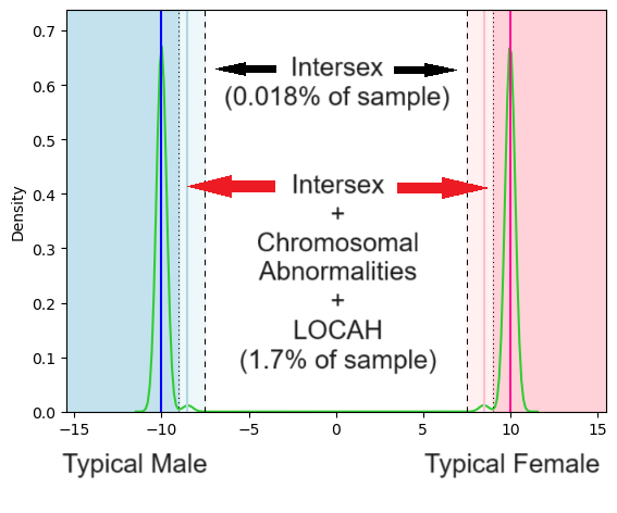 Now we can see small peaks in the density estimate to the right of the typical male score and to the left of the typical female score respectively reflecting the sub-populations with chromosomal abnormalities, LOCAH etc. And if we wanted to choose a boundary that matched up with the Anne Fausto-Sterling definition of intersex we could say anyone with a score below -9 is a man and anyone with a score above +9 is a woman which would result in a larger portion classified as intersex: