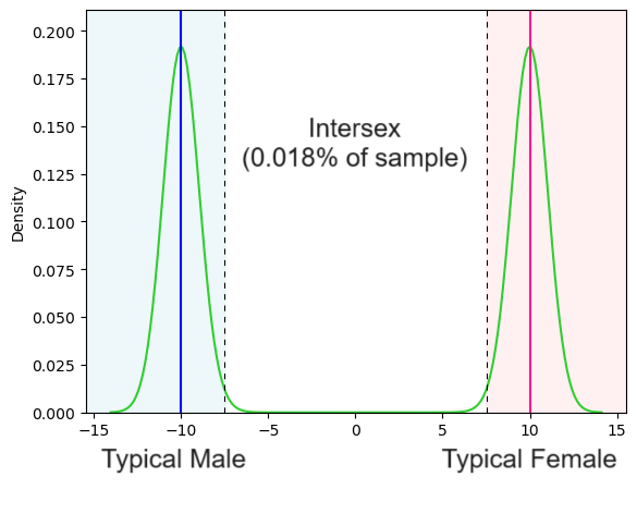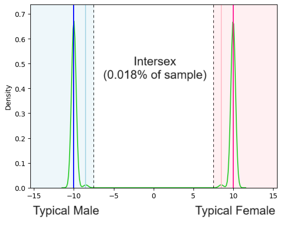 Note: To create these plots I simulated sex score data for sub-populations of typical males, females, intersex and those with chromosomal abnormalities/LOCAH assuming the average scores for each population and estimated relative sizes of these sub-populations discussed above. If you’re interested you can access the Jupyter notebook here.